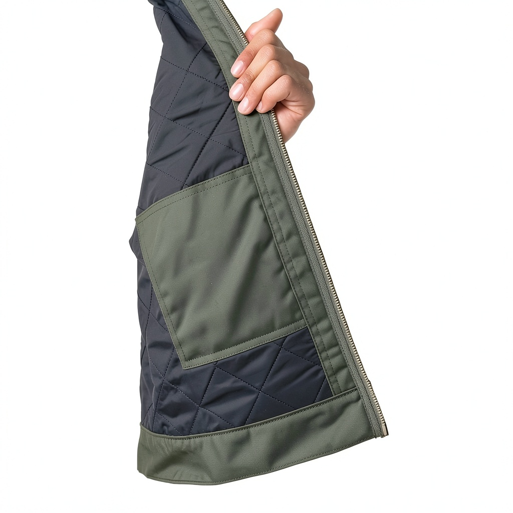 The shell is polyester/cotton twill, and the lining is quilted nylon taffeta, providing a balance of durability and lightweight insulation.