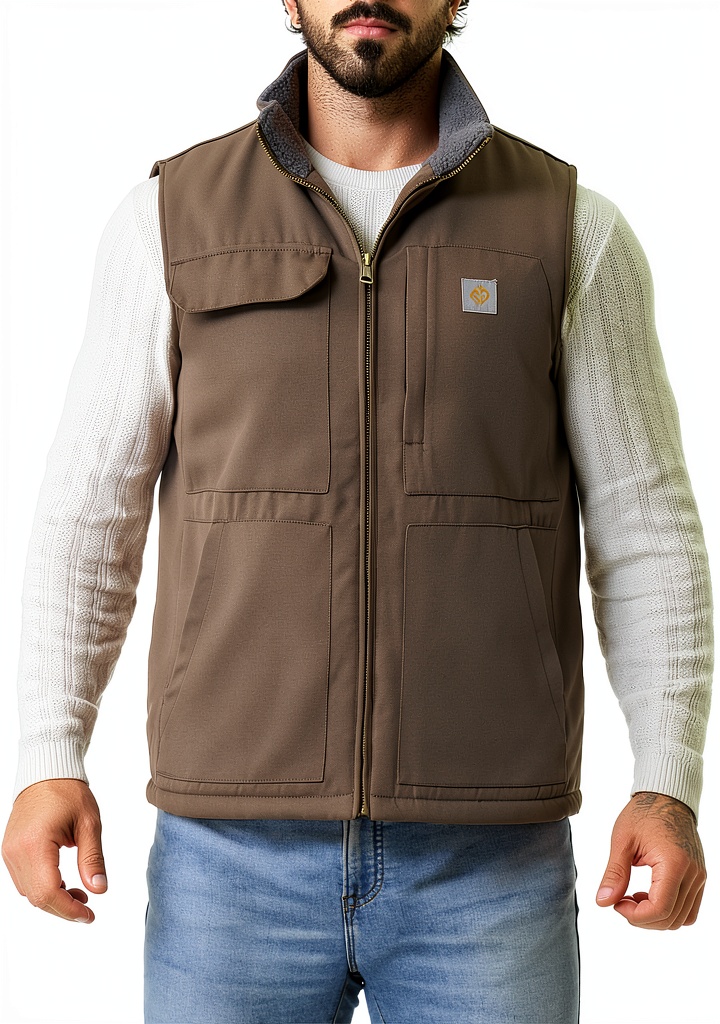 This men’s work vest is designed for durability and everyday functionality, crafted from 100% polyester fiber fabric that resists wear and tear. It includes a brushed lining for enhanced warmth, a sturdy copper zipper for reliable closure, and waterproof fabric to keep you dry in various conditions. With six pockets—two chest, two hand, and two inner—it offers ample storage for tools, phones, and personal items, making it a versatile addition to any work wardrobe.